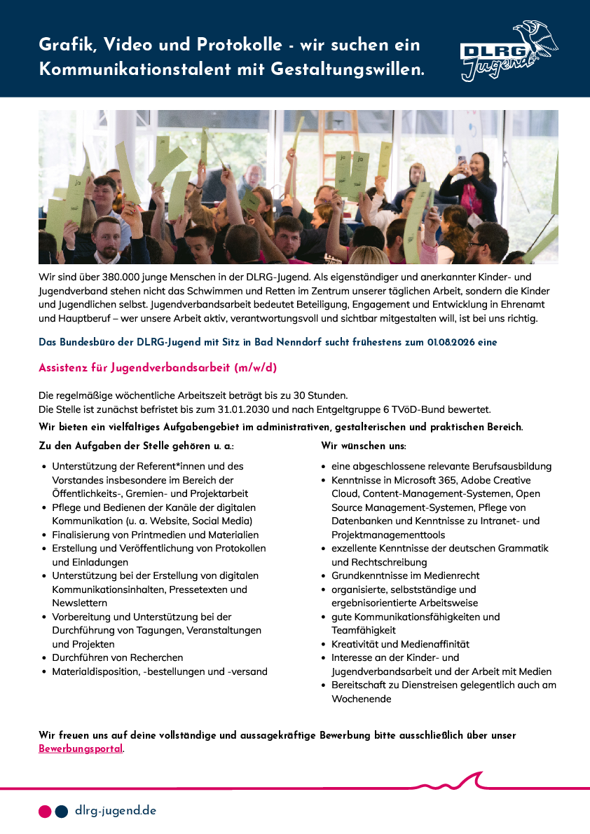 Das Bundesbüro der DLRG-Jugend mit Sitz in Bad Nenndorf sucht frühestens zum 01.08.2026 eine