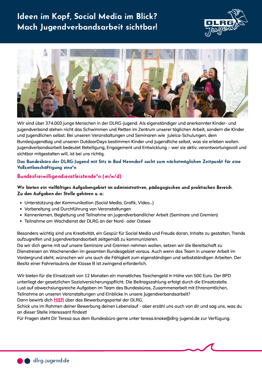 Das Bundesbüro der DLRG-Jugend mit Sitz in Bad Nenndorf sucht zum nächstmöglichen Zeitpunkt für eine Vollzeitbeschäftigung eine*n